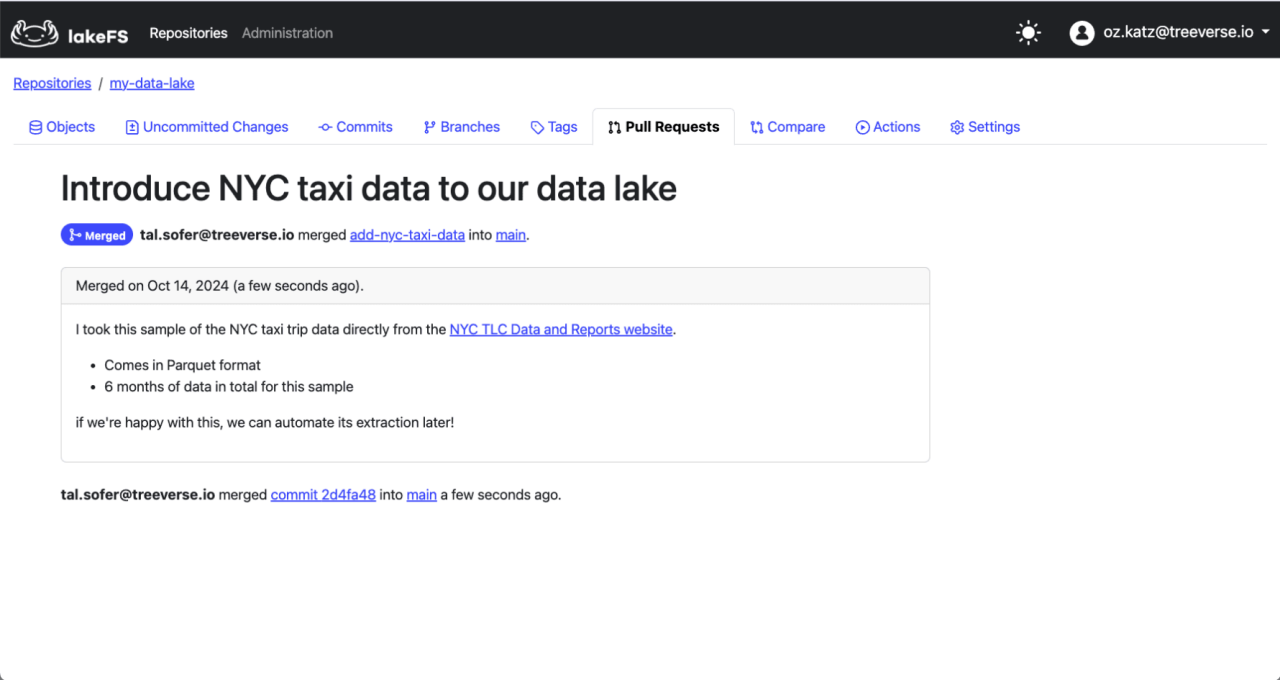 As with any lakeFS reference, reviewers can take the source branch, query, test and modify it as necessary prior to merging.